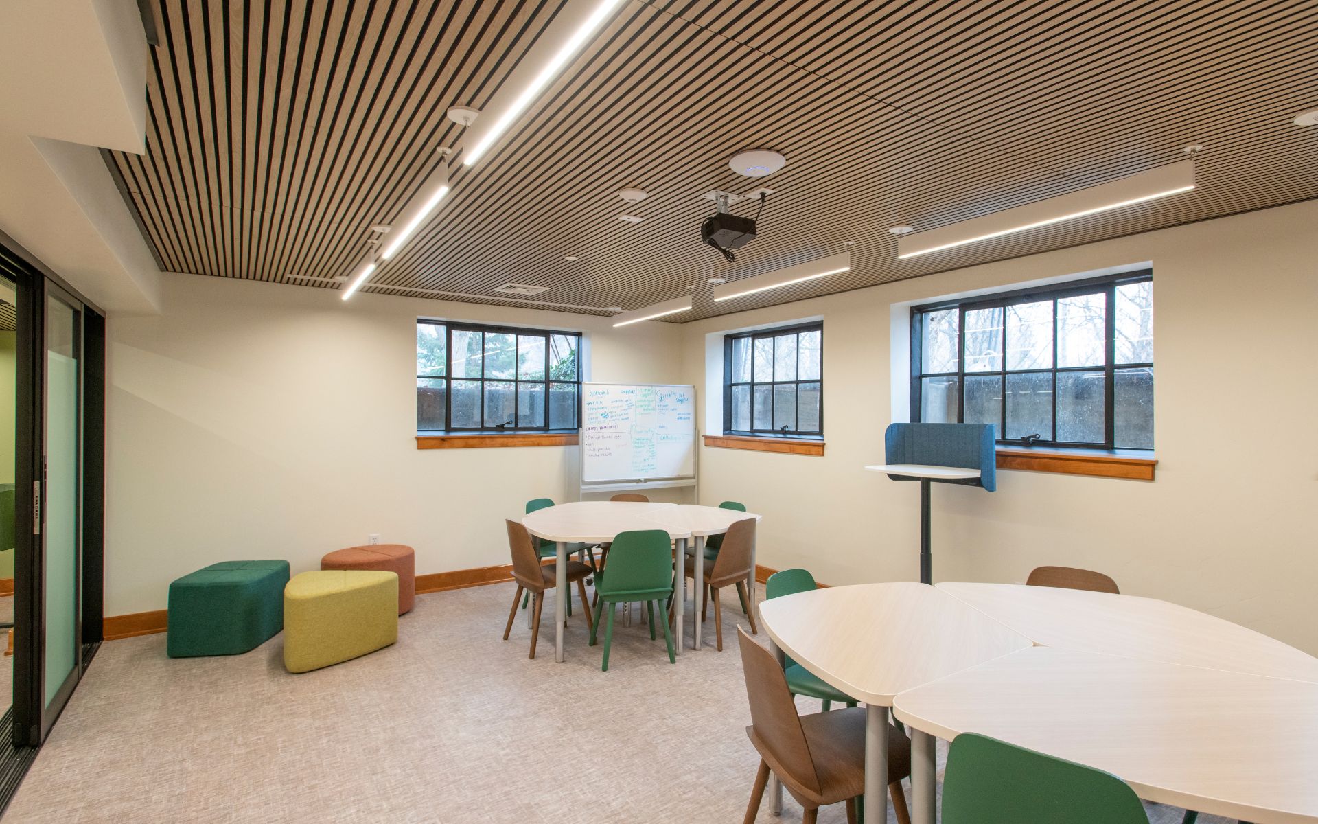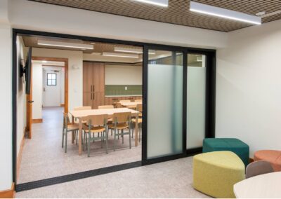 This project is a tenant improvement spanning the lower, middle, and upper levels of the building. The lower level has been redesigned as a learning environment, featuring multiple classrooms, including one large open classroom that integrates three flexible learning spaces. One of these classrooms is enhanced with a kitchenette and coffee bar to support both staff and student use. The upper level has been transformed into staff offices and a dedicated breakroom, creating a functional and supportive workplace. The middle level remains largely unchanged, except for material upgrades to align with the overall design, along with an updated restroom and closet. Beyond the interior, the project extends to the exterior with the addition of an outdoor classroom, stage, and gathering space, and provides opportunities for classes and events.
